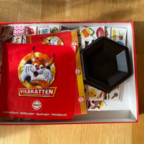 Vildkatten Go! kortspil. Spillet er en rejseudgave af Vildkatten, hvor spillerne skal finde og matche billeder på kortene. Æsken indeholder billedkort og spillevejledning. Egnet som familiespil og til børn, der øver observation og hurtig genkendelse af motiver.
