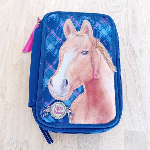 Top Model penalhus med motiv af figur på forsiden. Penalhuset har lynlåslukning og er egnet til opbevaring af blyanter, viskelæder og andet skoleudstyr. Designet har mørk baggrund med glittereffekt og Top Model-logo på forsiden.