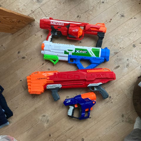 Nerf legetøjsblaster sæt i plast i rød farve. Sættet består af flere forskellige dartblastere i forskellige størrelser, velegnet som legetøj til børn. Blasterne er udført i hård plast med detaljer i blandt andet blå, sort og orange. Egnet til indendørs og udendørs leg, hvor børn kan skyde med skumpile mod mål eller til rolleleg. 150 kr for den hele eller 75 for et og den lille pistol følger med helt gratis.