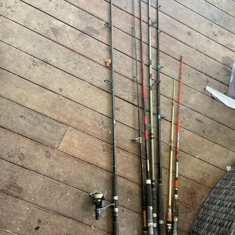 Har som du ser, en masse stænger der skal sælges, båden er solgt. Så nu skal der fiskes på kysten istedet. Der er stænger til 100 kr, og nogle til ca 600-700 kr. Spørg gerne ind.