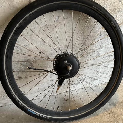 Der er 2 stk hjul med fælge 250W motor , dækkene næsten nye og motor virker fint