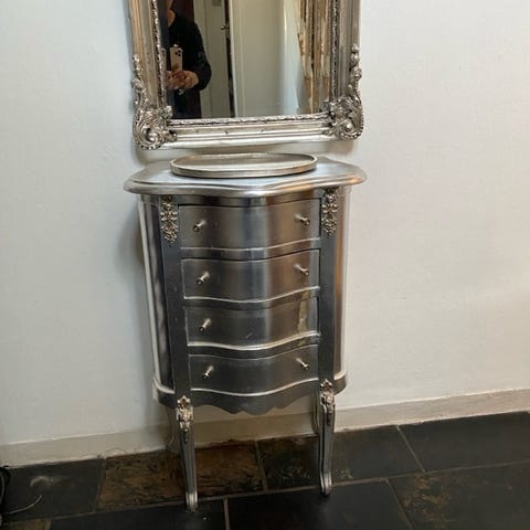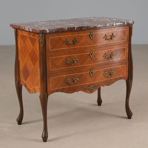 Louis XVI stil kommode af rosentræ. Top af rød marmor. Fremstår med slid og afslag på finer. H. 73, B. 57, D. 40 cm.
