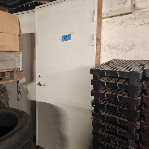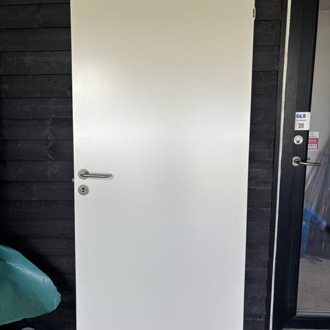 Dør m/karm. Mål (incl karm): H: 210 cm. B: 99 cm. D: 13 cm . Brugt.