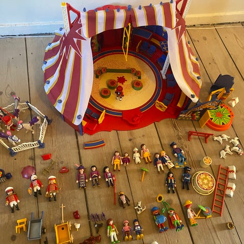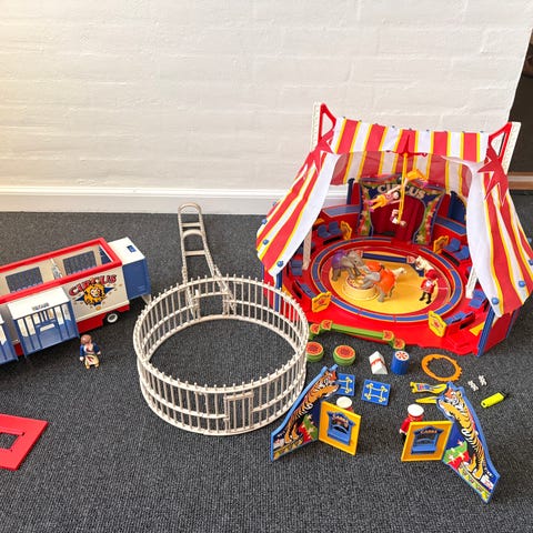 Playmobil cirkus telt legesæt med cirkusmanege og telt. Sættet indeholder cirkustelt i rød, gul og hvid med rund manege på ca. 34,5 cm i diameter og samlet diameter på ca. 57 cm. Med hegnselementer, indgange og forskellige tilbehørsdele til cirkusleg. Egnet som byggesæt og rolleleg for børn, der kan kombinere det med andre Playmobil-figurer og -sæt.