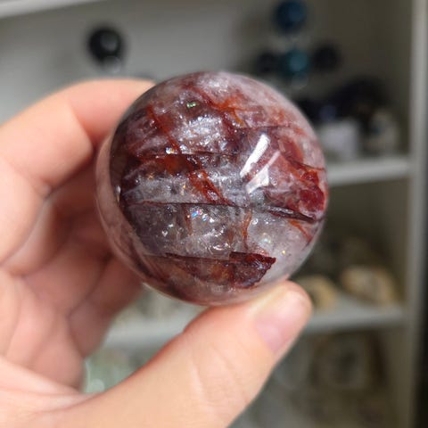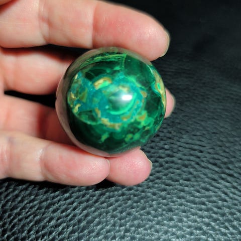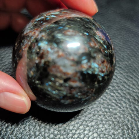 Kugle med rubin og kyanit i fuchsite på 94 gr., og en diameter på 3,9 cm.