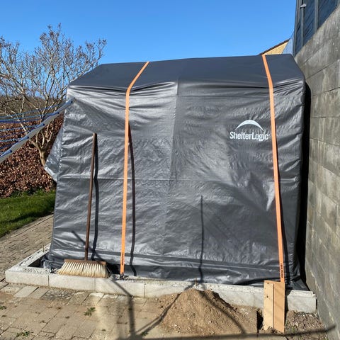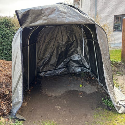 Garagetelt / opbevaringstelt fra Dancover. Har små huller - særligt i gavlene. Dog ikke store nok til at der kommer vand/regn ind.