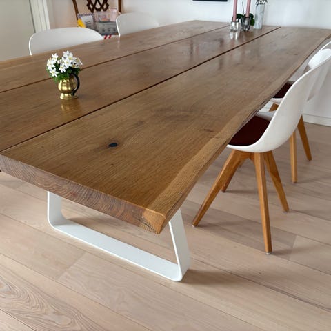 Hvidolieret og lakeret plankebord med speciallavet jernben. Står meget stabilt.