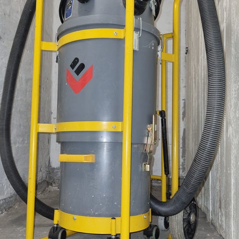 DUST DEPUTY forseperator fra ONEIDA Air Systems. Forseperatoren er en cyklon, der monteres mellem støvsugerslange og støvsugeren for at opsamle støvet inden det rammer støvsugerposen, så man beholder sugeevnen. Der medfølger en ekstra ( ubrugt ) spand på hjul, som kan fastgøres til støvsugeren, så disse følges ad.