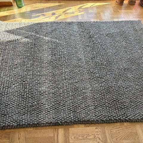 Hay Peas tæppe i størrelsen 200 x 300 cm. Tæppet har farven mørkegrøn og en struktur med ulddutter. Der er få steder hvor ulddutterne er gået løs (se billede). Ellers et rigtig dejligt tæppe.