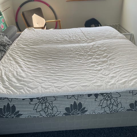 Topmadras, 180x200 cm. Jysk Dreamzone madras i hvid. Madrassen har quiltet overflade og synlige syninger i længderetningen. Farven er lys/offwhite med mørk kantbånd langs siderne. Sælges som vist på billederne.