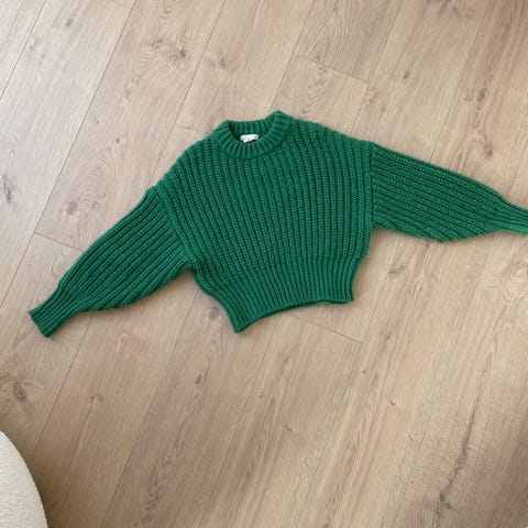 H&M striktrøje i størrelse S. Trøjen er i beige og råhvide striber. Bomuld. Kort, ribstrikket model med rund hals og korte ærmer.