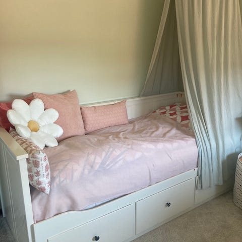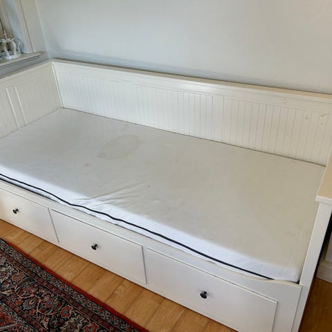IKEA Hemnes dagseng med tre skuffer i hvid. Den fungerer som enkeltseng til daglig brug og kan udtrækkes til dobbeltseng. Under sengen er der tre integrerede opbevaringsskuffer til sengetøj, puder eller andet tilbehør. Sengen har ryg- og gavlpaneler, så den kan bruges både som sofa og seng i soveværelse, gæsteværelse eller børneværelse.