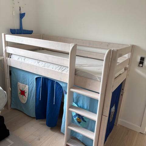 Flexa højseng til børneværelset. Sengen er i en forhøjet model med sengehest hele vejen rundt for øget sikkerhed. Under sengen er der plads til leg, opbevaring eller ekstra møbler. Velegnet til større børn, der ønsker ekstra gulvplads under sengen.