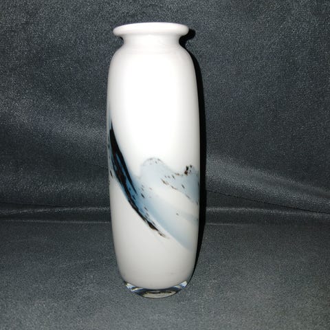 "Ægformet vase fra serien "Atlantis" med pålagt blå rand, opalhvidt glas med blå og sortbrune klatter. Overfang af klart glas.