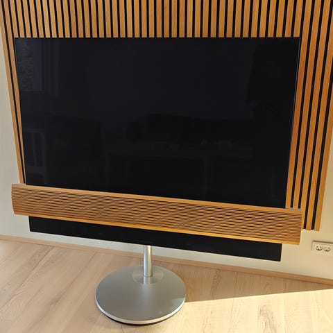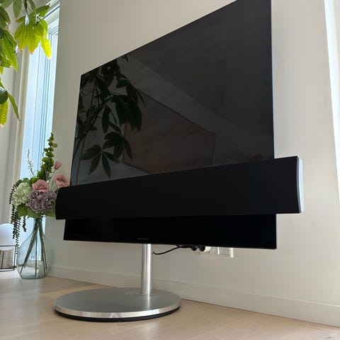 Bang & Olufsen fladskærms-tv Gen.2 med integreret soundbar. Tv’et står på rund motordreje fod og har en bred, indbygget højttaler under skærmen samt Beoremote. Egnet til brug i stue eller mediehjørne, hvor der ønskes tv og lyd samlet i én enhed.