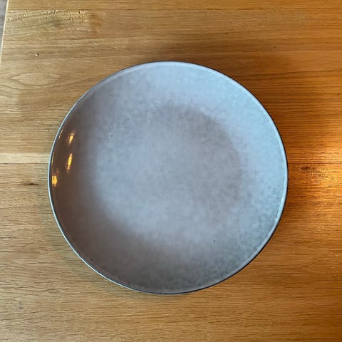 Tallerken i rustfrit stål. Rund form med let opadbøjet kant. Velegnet som serveringstallerken, bakke eller til daglig brug i køkkenet. Overfladen fremstår med brugsspor, men funktionel til almindelig anvendelse. Diameter ca 19 cm.