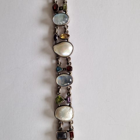 Dette smykke fremstår som et vintage modernistisk sølvarmbånd med 10 hvide spectrolit-sten fra månestensfamilien.