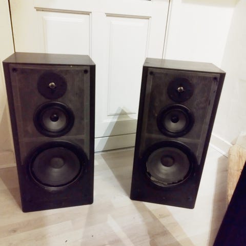 Spiller kanon godt. Ingen brud eller revner i basophæng. Diskanter ligesom nye. Små skruehuller fra tidligere loftsbeslag. Betyder intet for lyden. Mål: 39,5*25,5*22 cm.