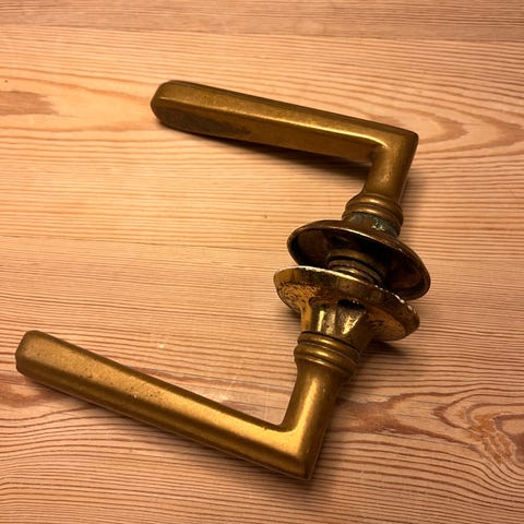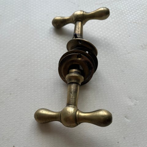 Dørgreb, model i messing med blank guldfarvet overflade. Sættet består af to greb med klassisk, afrundet form og kugleformet overgang til roset/fatning. Egnet til montering på indvendige døre, hvor der ønskes et traditionelt udtryk i messing.