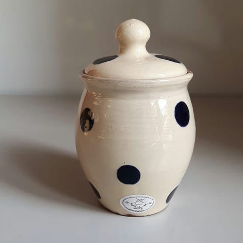 Keramikkrukke med låg fra Bering House of Flowers, der forestiller deres tidligere forretning på Købmagergade nr. 7 i København.