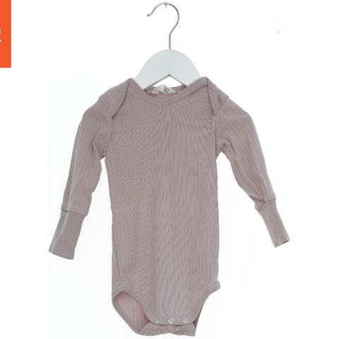 En ærmeløs bodystocking til babyer, lavet af blødt materiale. Den har tre trykknapper forneden for nem lukning og skift af ble. Farven er lys lilla og mærket angiver størrelsen 68.