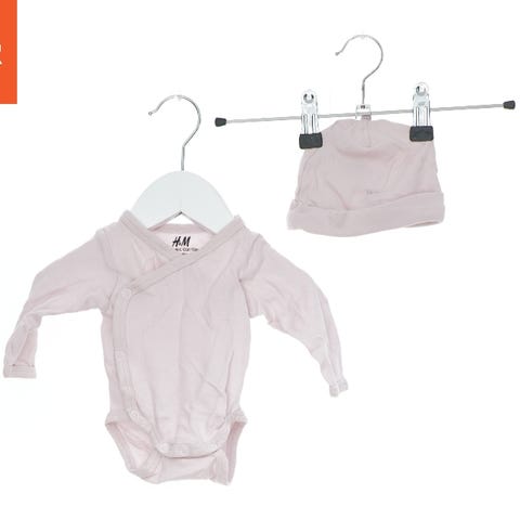 Lyserød bodystocking med små hvide striber og lange ærmer. Den har en praktisk lukning foran med trykknapper. Den medfølgende hat er også lyserød med små hvide striber. Bodystockingen er i størrelse 52/56 og fra mærket H&M.