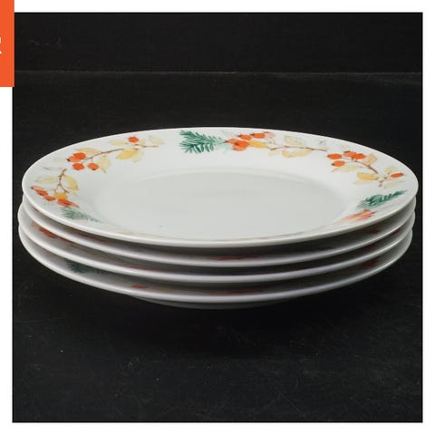 Et sæt af fire hvide tallerkener med en diameter på 19 cm. Tallerkenerne har en dekorativ kant med mønster af farverige blade og orange bær. Der er også små nisser som del af dekorationen. Bagsiden af tallerkenerne bærer et stempel, der kunne indikere producent eller designer.