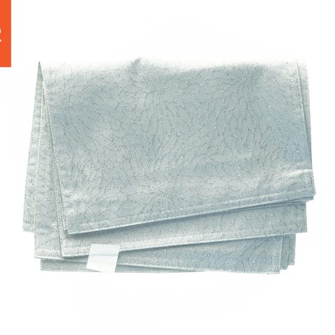 Et sæt af fire stofservietter med et diskret indgraveret mønster. Servietterne synes at være lavet af et holdbart stof og præsenterer ingen synlige tegn på slitage eller skader.