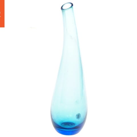 En lille blå glasvase med en højde på 9 cm. Den har en rund, bred bund med smalle sider, der gør den velegnet som dekoration eller til små blomsterbuketter.