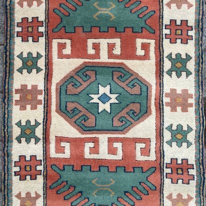 Oprindelse Afghanistan; Kaukasisk model (ubrugt); håndknyttet tæppe i uld på bomuld, i meget god stand, 162 × 121 cm. Klik på den blå "gå til varen" knap, for at købe eller byde på denne vare. Den samlede pris vil blive vist inden du afgiver dit bud.
