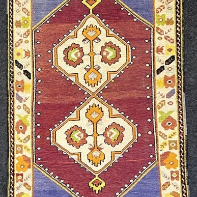 Tæppe fra Orienten, håndspundet i uld, meget fint, med et stort geometrisk centralt medaillon og en stor kant omkring. På en beige baggrund, blålig og rød.