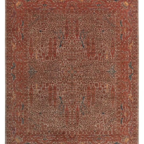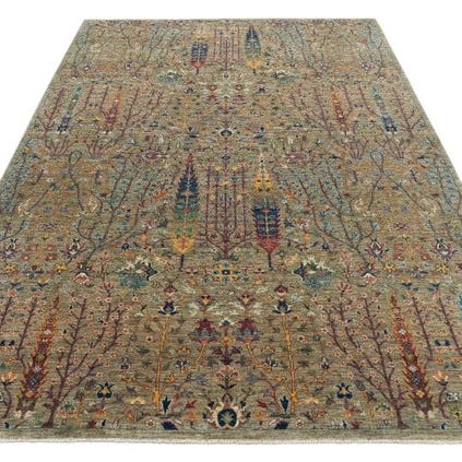 Denne usædvanligt fine håndknyttede designer-tæppe præsenterer et detaljeret Livets træ-mønster, der står for harmoni, vækst og skønhed.