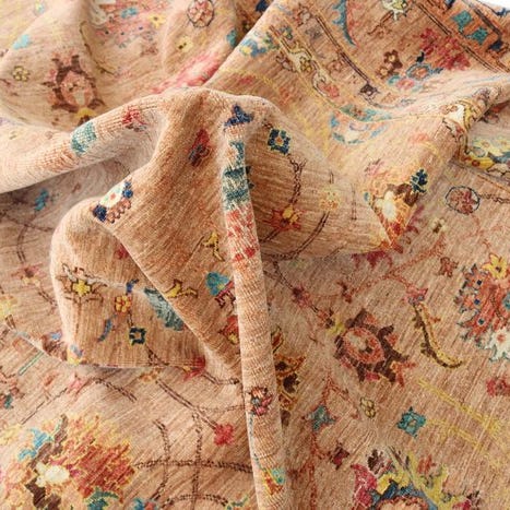 Den varme grundfarve, kombineret med klare blå, grønne og okker nuancer giver et elegant, moderne udtryk – et perfekt samspil mellem traditionel vævningsteknik og tidssvarende design. Takket være den meget fine knudning har tæppet en ekstraordinær klarhed i mønsteret og en behagelig blød berøringsfornemmelse.