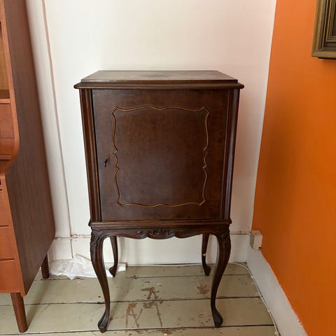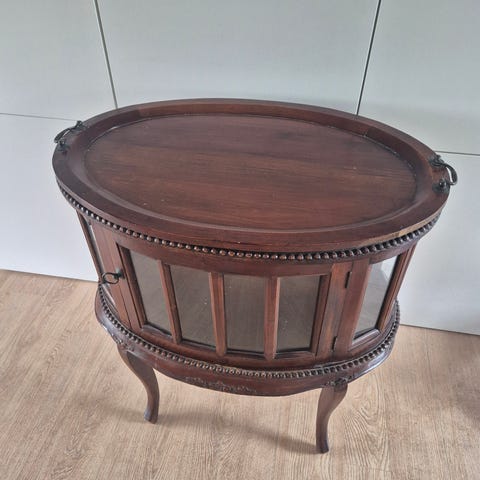 Møblet åbner sig til en øverste bordplade og præsenterer en façade prydet med raffinerede blomsterkompositioner. Siderne er også dekorerede og giver en gennemført finish set fra alle vinkler. Hængslerne og beslagene i patineret metal giver et ekstra præg af autenticitet.