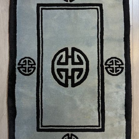 Vi præsenterer et elegant kinesisk Art Déco-tæppe, håndknyttet 100% i ren uld på bomuld med indbygget bundbeskyttelse.