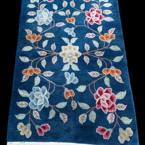 Det skiller sig ud med sit sofistikerede felt i dyb blå, kombineret med en lys kant udsmykket og et centralt medaillon inspireret af blomster, typisk for den kinesiske Art Déco-stil. Uldet er blødt, tætvævet og med god glans, hvilket giver en behagelig tekstur og stor overordnet kvalitet.