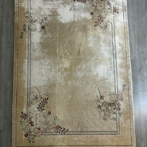 Oprindelsesland: Kina; Modell: China Art Deco; håndknotet tæppe af 100% uld på bomuld, mål 262 x 166 cm, vægt 10 kg, periode 1940–1950, generelt i god stand med indbygget beskyttelse. Klik på den blå "gå til varen" knap, for at købe eller byde på denne vare. Den samlede pris vil blive vist inden du afgiver dit bud.