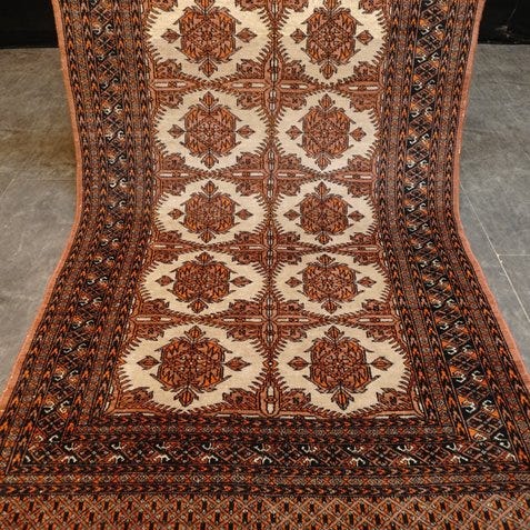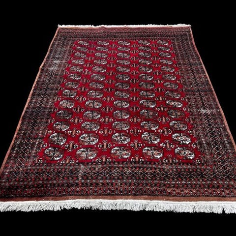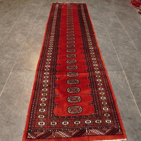 Håndknyttet Buchara Art Deco tæppe fra Pakistan, uld på bomuld, 180 × 123 cm, generelt i god stand med alder- og brugsspor, fra det 21. århundrede, med ægthedscertifikat. Klik på den blå "gå til varen" knap, for at købe eller byde på denne vare. Den samlede pris vil blive vist inden du afgiver dit bud.