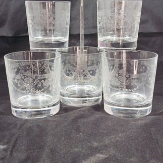 Splendide whiskyglas i smaragdgrøn farve, vidunderligt udskåret og hånddekoreret, unikke i deres slags, afsluttet med store og kostbare detaljer i 24 kt guld, udskåret i relief, i ægte muransk stil.
