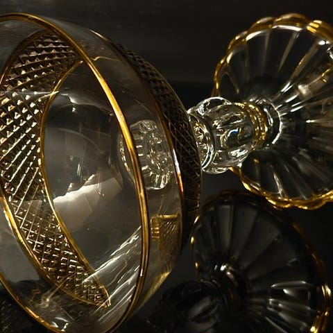 En rig dekoration udføres strengt med Pantograf og hele den øverste del af glasset broderes, og generøse strøg af rent guld gør det endnu mere rikt.