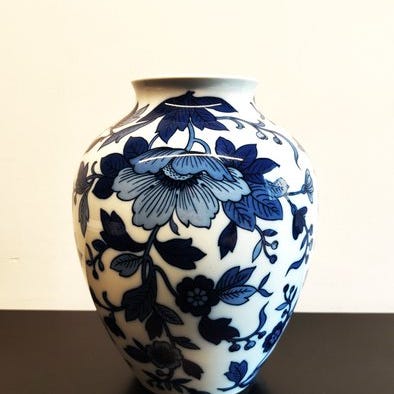 Vasen, der i sin form henviser til modeller fra den orientalske tradition, især kinesisk, har en elegant slank form med brede sider og en smal åbning, prydet af en blå streg.