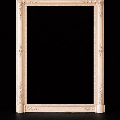 Smukt bordspejl af tysk porcelæn, sandsynligvis Dresden. Tre sider er prydet af rige blomsterkranse i farverige nuancer, mens den øverste del har et udskåret ornament, der er overbygget af en gesims. Den nævnte øverste del er restaureret. Med stor scenisk virkning og pragt.