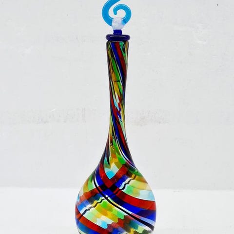Øjenfristende og begrænset udgave vase af håndværkeren designer og mester glasblæser A. Ballarin i Murano (Venedig). Denne nye og flotte vase er produceret i et begrænset oplag og tilpasset, og leveres med certifikat for ægthed. Vasen er udført i et komplementært/primært farvekontrast. Personligt mener jeg, at det er et af Ballarins smukkeste designs.