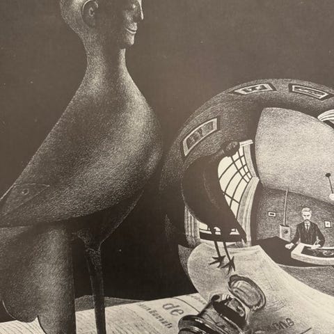Billedet gengiver en af hans berømte umulige arkitekturer, kendetegnet ved uendelige trapper, paradoksale perspektiver og menneskefigurer fanget i et logisk rum.