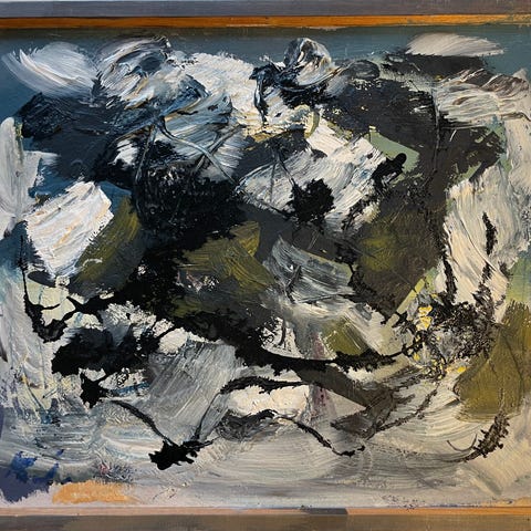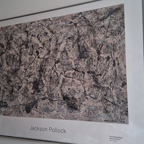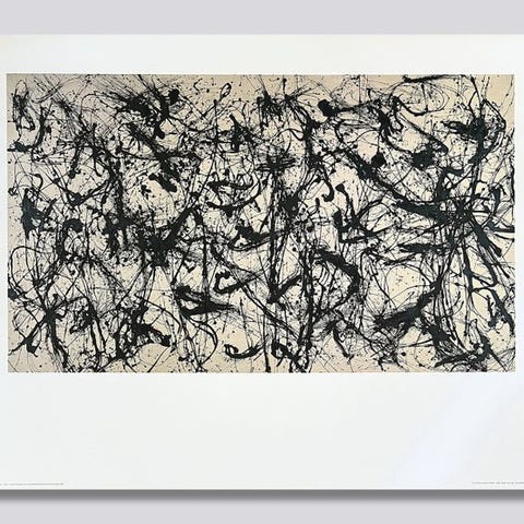 Dette emblematiske værk fra abstrakt ekspressionisme skildrer Jackson Pollocks dripping-teknik, med drypp og lag af hvidt, sort, guld og lyserødt. Kompositionen fanger det frie gest og den instinktive rytme, der gjorde Pollock til et ikon i det 20. århundredes kunst.