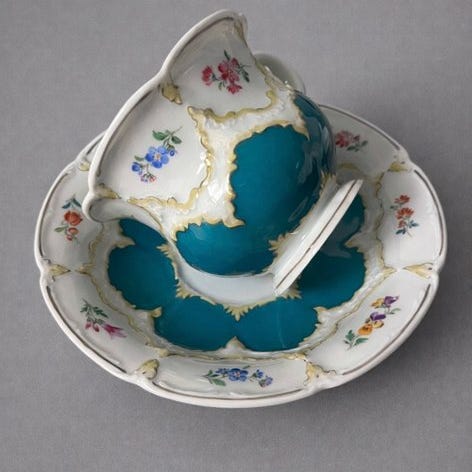 Oval gennembrudsskål fra porcelænsfabrikken Meissen med underglasurblåt sværdemærke. Mærket er uden slibemærker, altså 1. klasse. Derudover findes modelnummeret 54906 samt præget 187 P. Ud fra sværdformen, det femsifrede modelnummer og trykmærket er en datering til omkring 1960–1975 sandsynligvis.