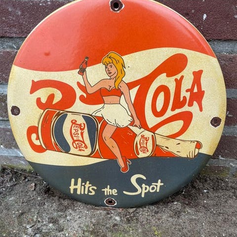 Vintage stand med brugsspor og rustdannelse omkring monteringshullerne. Farverne er stadig klare, og emaljen har stadig