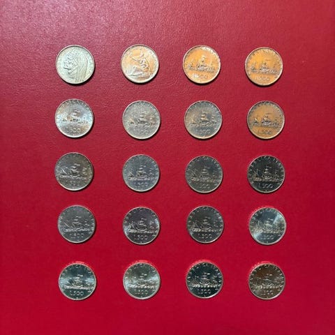 tyve italienske sølvmønter fra Repubblica Italiana, herunder 14.500 Lire Caravelle, 5.500 Lire Quadriga og en australsk dollar, alle ikke graders. Klik på den blå "gå til varen" knap, for at købe eller byde på denne vare. Den samlede pris vil blive vist inden du afgiver dit bud.