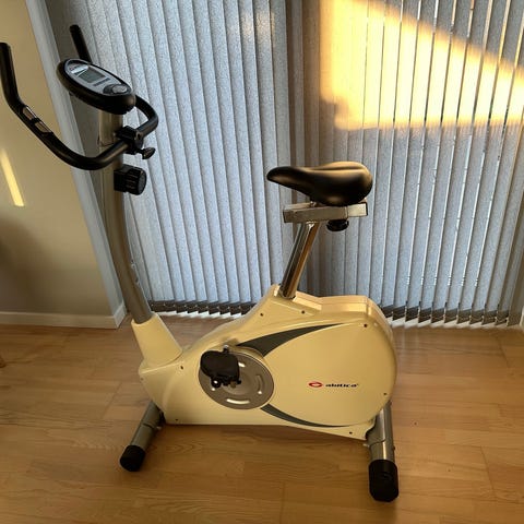 Abilica motionscykel i sort med elektronisk display. Cyklen har styr med indbygget computer, der viser træningsdata som tid, distance og andre funktioner efter valg på panelet. Sædet er polstret og højdejusterbart, og pedalerne har remme til at holde fødderne på plads under træning. Velegnet til indendørs konditionstræning i hjemmet.