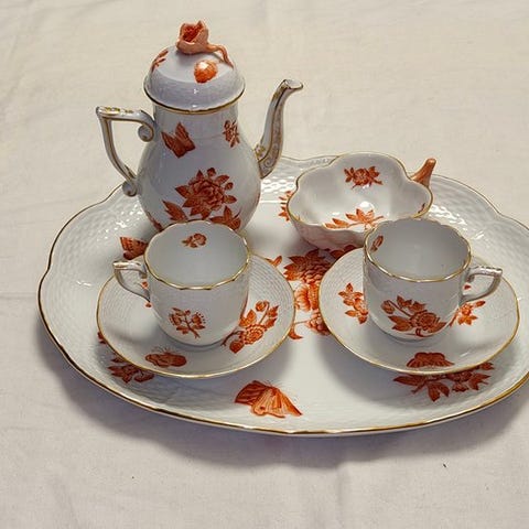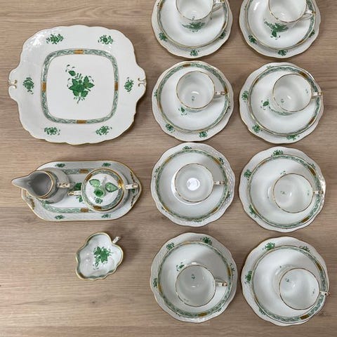 Et serveringsfad til kage eller frugt med en dekoration kendt som Chinese Bouquet, skabt for grev Albert Apponyi, en berømt ungarsk politiker og diplomat fra slutningen af 1800-tallet. Tegningen forestiller en kurv med stiliserede indiske blomster, malet helt i fri hånd af Herends mestermalere. i fremragende stand.